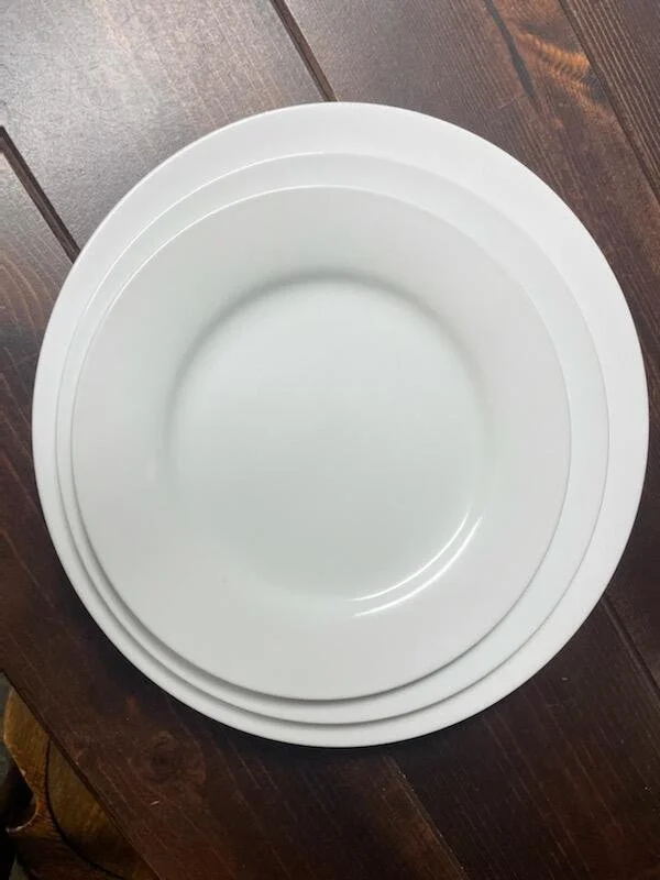 Bone white China. Dinner 10.5", Salad 8", and Lunch 9" . Rented in racks of 20.